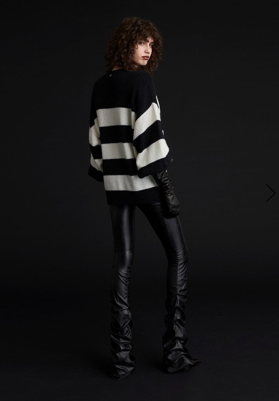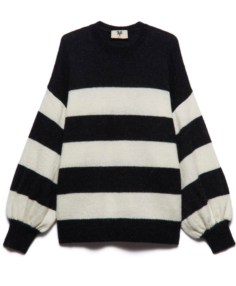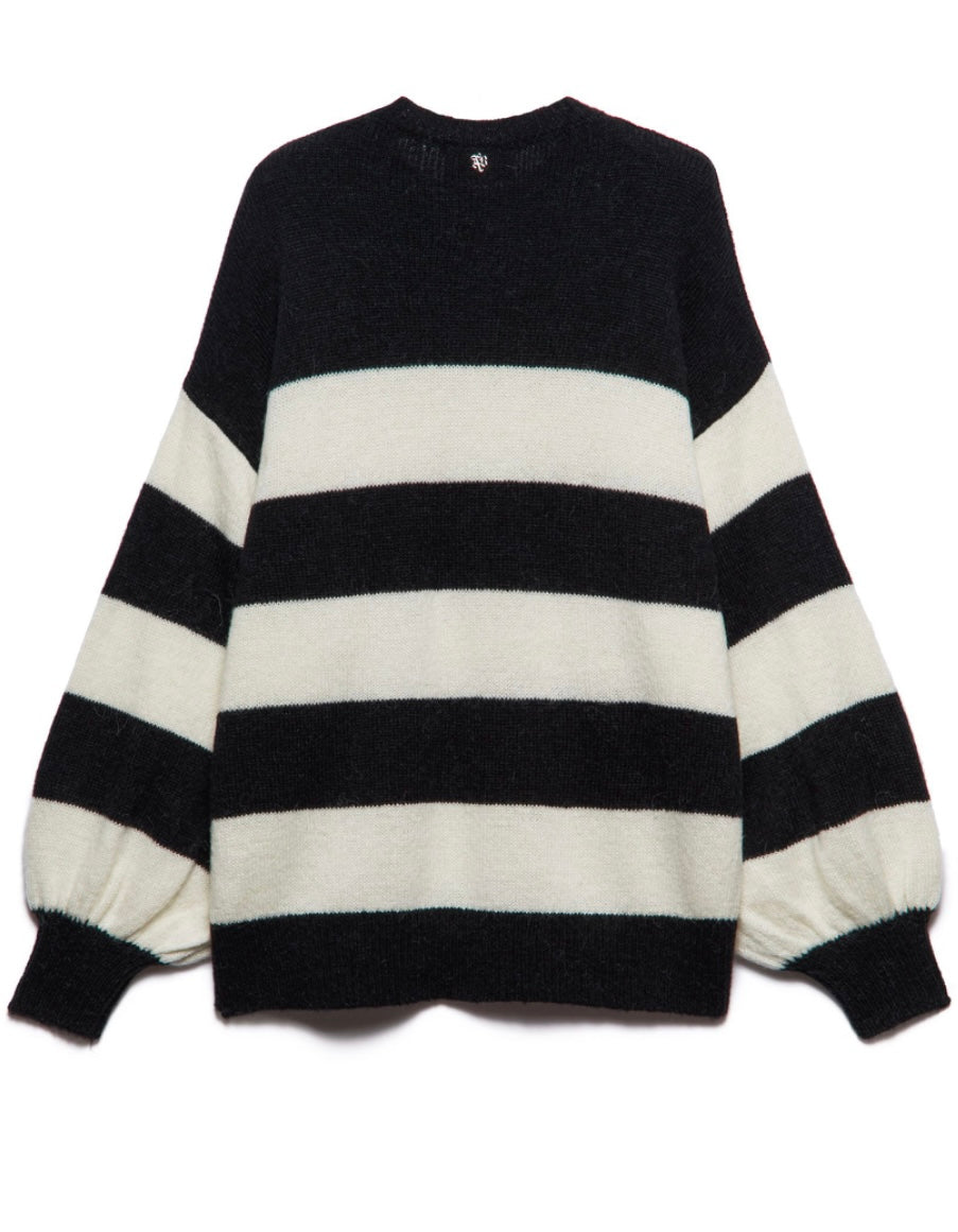 IL MAGLIONE LISA UNISCE LA MORBIDEZZA DELLA MAGLIA A UNA VESTIBILITÀ OVER E RILASSATA, VALORIZZANDO LA FIGURA CON UN TOCCO DI ELEGANZA CASUAL E CONTEMPORANEA. LE AMPIE RIGHE ORIZZONTALI CREANO UN MOVIMENTO VISIVO DINAMICO, MENTRE IL GIROCOLLO CLASSICO E LE MANICHE LUNGHE CON POLSINI A COSTE BILANCIANO IL TUTTO CON SOBRIETÀ E STRUTTURA. IL CIONDOLO LOGATO SUL RETRO COMPLETA IL LOOK CON UN DETTAGLIO DISTINTIVO, RENDENDOLO PERFETTO PER CHI CERCA UN CAPO ACCOGLIENTE, STILOSO E VERSATILE.